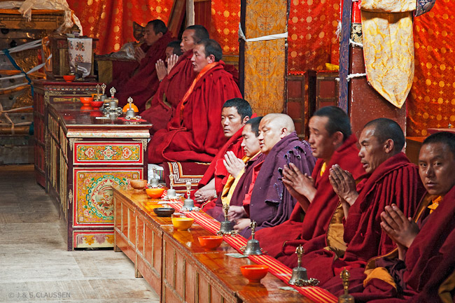 Buddhistische "PUJA" (Andacht unter dem Aspekt der Verdienstübertragung) der Moenche im Tsurphu-Kloster
